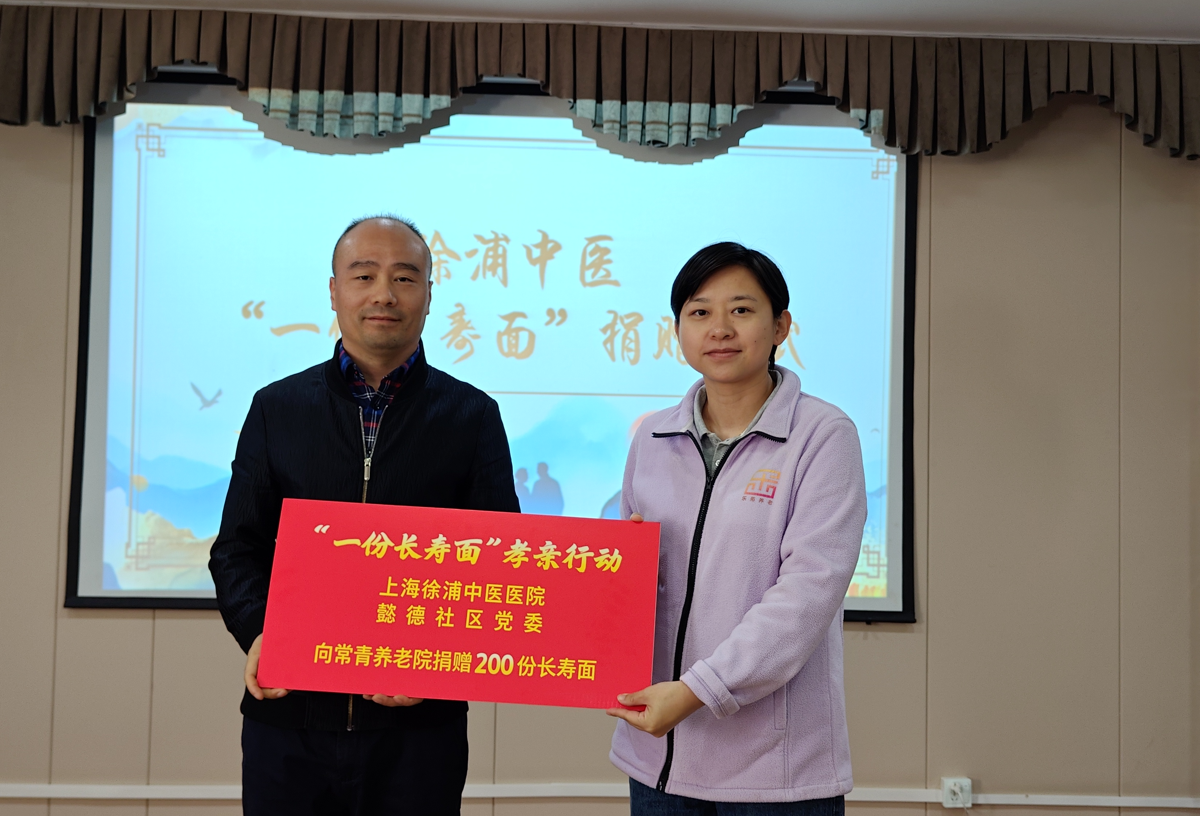活动伊始,由懿德社区党委向现场的老人们、演出人员和工作人员们送上节日祝福与美好问候。捐赠仪式上,懿德社区党委和徐浦中医医院为常青养老院老人代表献花并送上节日慰问。最后,常青养老院的代表上台,接受由徐浦中医医院提供的重阳节长寿面捐赠仪式。